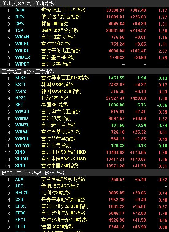 周五,美國三大股指全線收漲,道指漲1.17%報33390.97點,標普500指數漲1.61%報4045.64點,納指漲1.97%報11689.01點。本周,道指漲幅達1.75%,標普500指數漲幅達1.9%,納指漲幅達2.58%。