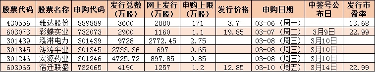 根據發行安排,下周(3月6日-10日)有6只新股發行,其中滬市主板有2只,創業板有3只,北交所1只。具體安排如下,周一1只:雅達股份(北交所);周二1只:彩蝶實業;周三3只:泓淋電力(創業板)、濤濤車業(創業板)、宏源藥業(創業板);周五1只:宿遷聯盛。