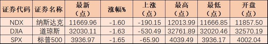 受消息面的影響,3月22日,美股三大指數震蕩走弱,截至收盤,集體跌超1%,其中,道瓊斯指數跌1.63%,報32030.11點;標普500指數跌1.65%,報3936.97點;納斯達克指數跌1.6%,報11669.96點。