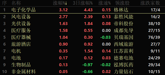 東方財富行業方面,截至3月27日11:30,86個行業板塊中10類上漲,占比11.63%,其中,電子化學品行業漲幅居首,達3.12%,另有風電設備、光伏設備、醫療服務和醫療器械等行業漲幅均超1%。下跌方面,保險跌幅居首,達2.31%,另有房地產服務、游戲、水泥、建材房和地產開發等行業跌幅超2%。