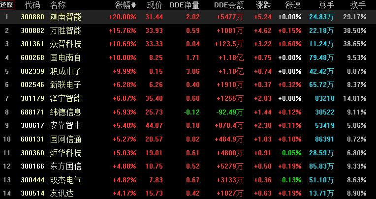 具體看,截至7月17日上午收盤,虛擬電廠板塊強(qiáng)勁拉升,漲幅居首達(dá)2.51%,資金凈流入達(dá)57.76億元。其中,迦南智能20cm漲停,萬(wàn)勝智能、眾智科技、國(guó)電南自等概念股漲幅均超10%。