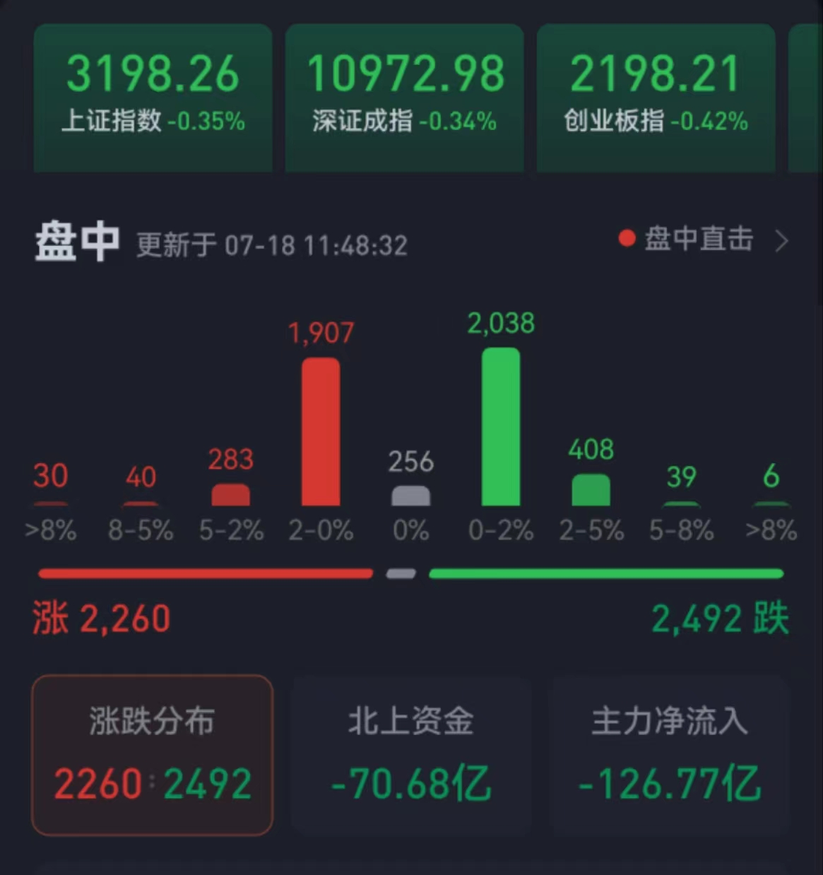 今日三大股指繼續震蕩整理。截至上午收盤,上證指數跌0.35%,報3198.26點,失守3200點整數關口;深證成指和創業板指分別跌0.34%和0.42%;滬深兩市合計成交額4807.8億元,總體來看,兩市個股跌多漲少。