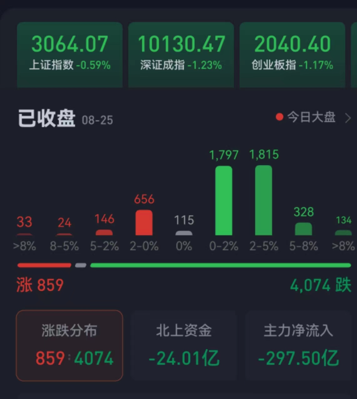 周五(8月25日),兩市合計成交金額7662.9億元,北向資金凈賣出24.01億元。總體上看,兩市個股跌多漲少,超4000只個股下跌。其中,漲停個股達23只,跌停個股達39只。