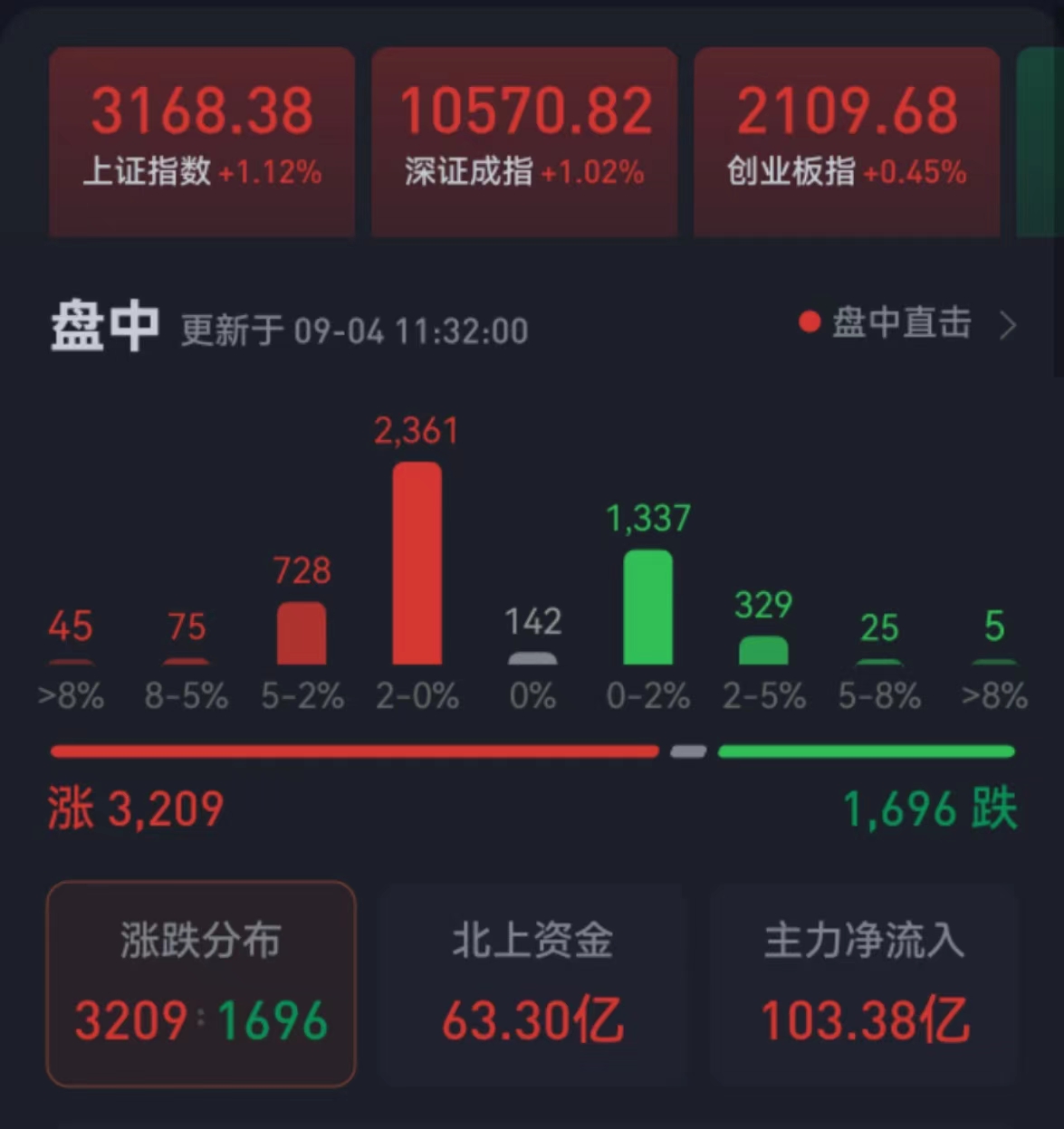 周一(9月4日),三大股指高開高走。截至上午收盤,上證指數(shù)漲幅達(dá)1.12%,報3168.38點;深證成指和創(chuàng)業(yè)板指漲幅分別為1.02%和0.45%;滬深兩市合計成交額5495.1億元,總體來看,兩市個股漲多跌少,超3200只個股上漲,其中,41只個股漲停,僅有1只個股跌停。