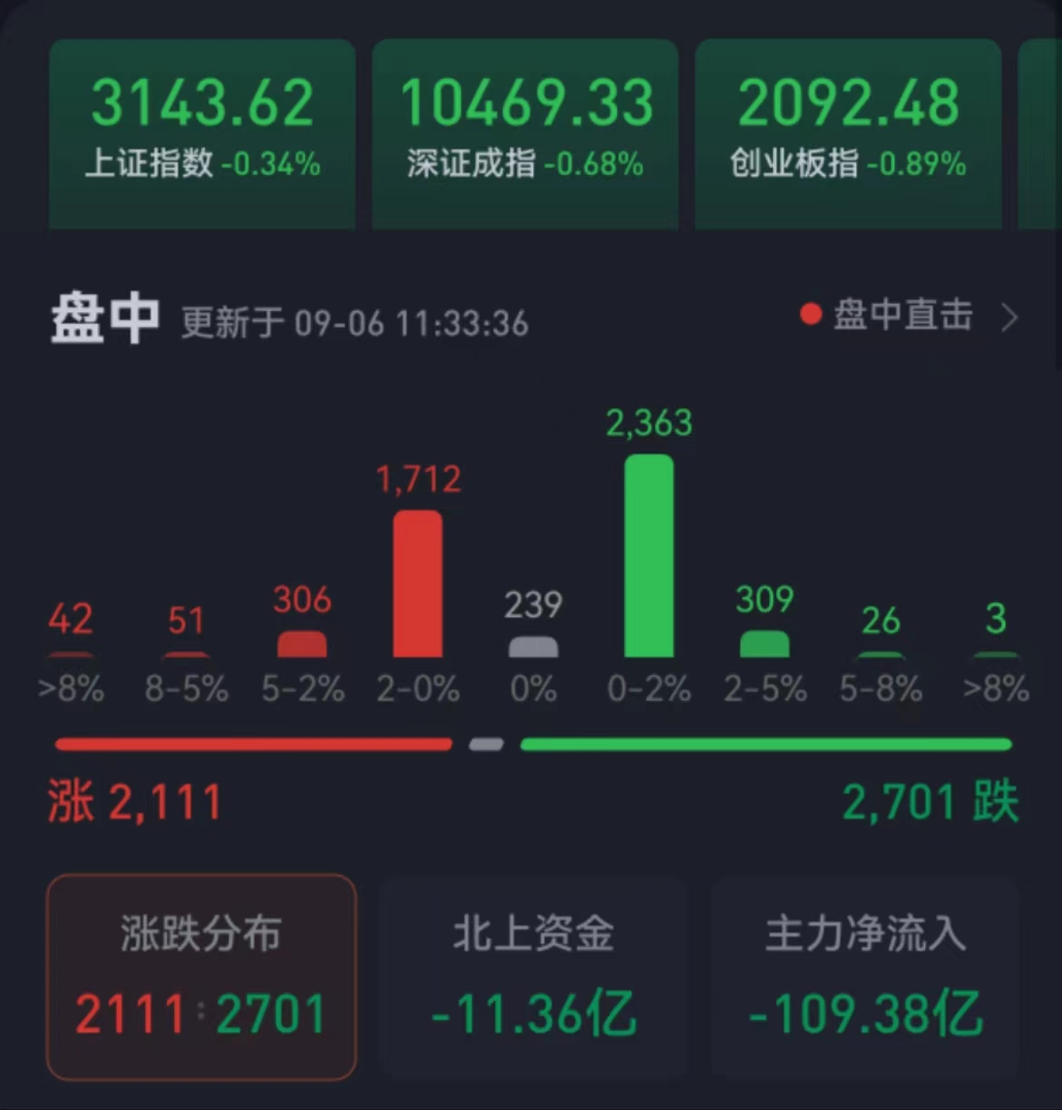 周三(9月6日),三大股指繼續(xù)震蕩整理。截至上午收盤,上證指數(shù)跌幅達(dá)0.34%,報3143.62點;深證成指和創(chuàng)業(yè)板指跌幅分別為0.68%和0.89%;滬深兩市合計成交額4356.6億元,總體來看,兩市個股跌多漲少。其中,29只個股漲停,1只個股跌停。