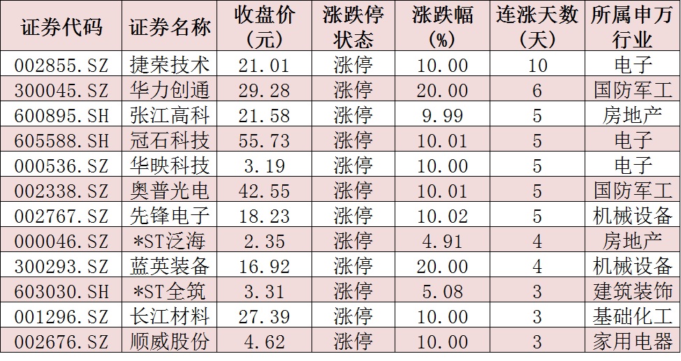 連續上漲3日且今日收盤漲停個股情況