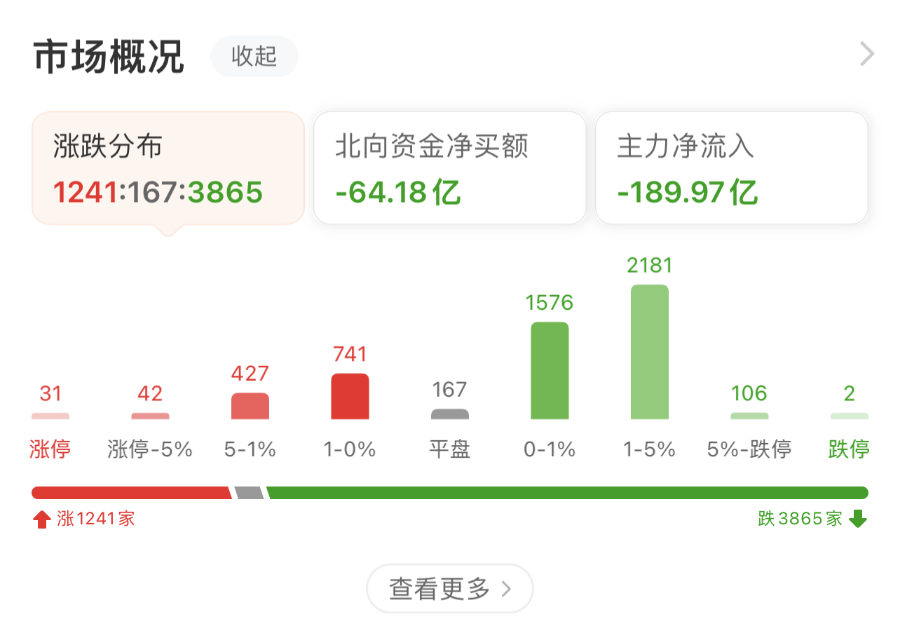 對于今日的市場表現,排排網財富公募產品經理朱潤康在接受《證券日報》記者采訪時表示,現在市場成交量越來越低迷,賣盤也已經基本枯竭,因此,市場再繼續大跌的可能性并不大。不過也很難走出持續上漲行情,一方面是因為上方套牢盤壓力較大,另一方面則是當前缺乏增量資金進場,市場觀望情緒較濃。接下來,市場會延續弱勢震蕩格局,繼續尋找市場底部,等待增量資金入場。