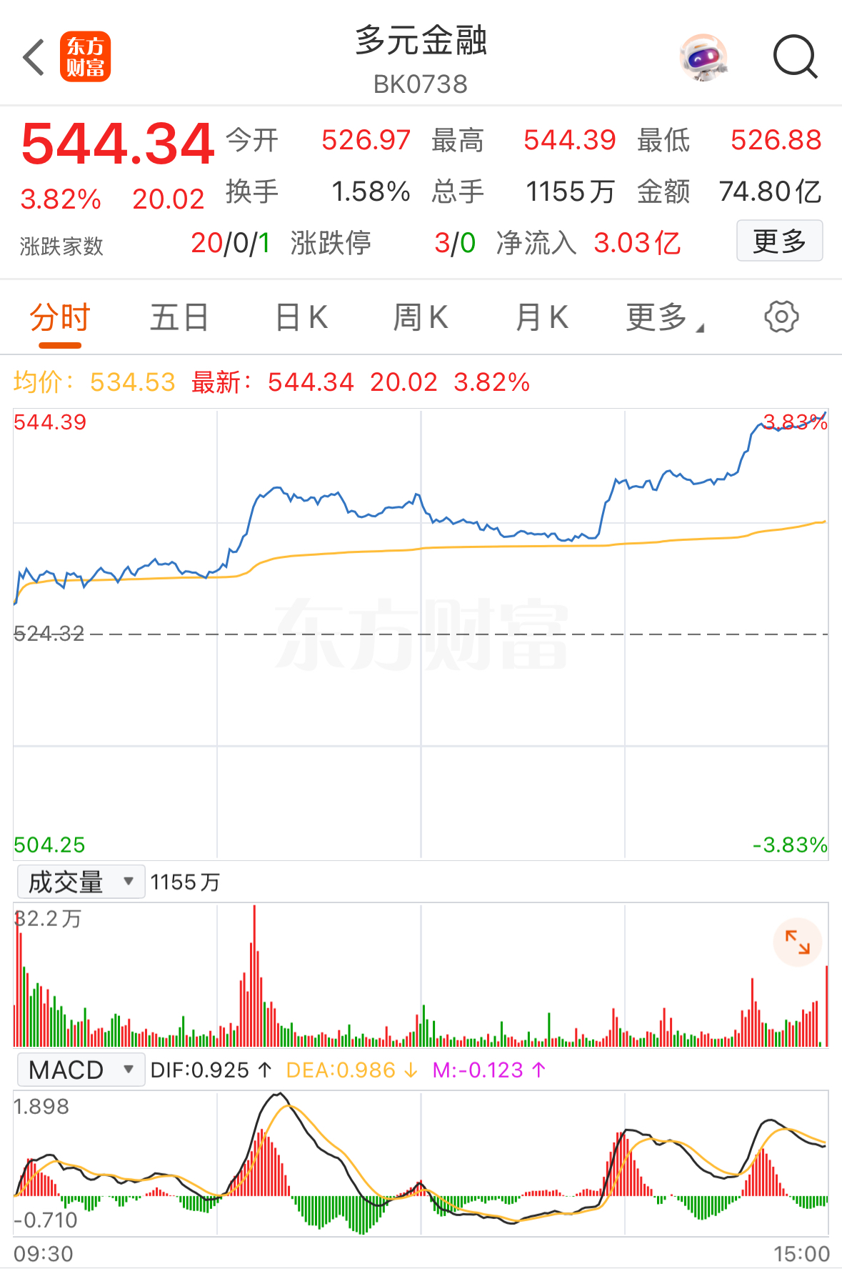 概念板塊中,13:50,多元金融板塊午后突然拉升,收盤時(shí)漲幅居前。整體板塊指數(shù)大漲3.82%,成份股中,昆吾九鼎投資控股股份有限公司(簡(jiǎn)稱“九鼎投資”證券代碼:600053)等個(gè)股午后拉漲停,截至收盤整體板塊22只個(gè)股,除中航工業(yè)產(chǎn)融控股股份有限公司(簡(jiǎn)稱“中航產(chǎn)融”證券代碼:600705)停牌,仁東控股股份有限公司(簡(jiǎn)稱“*ST仁東”證券代碼:002647)下跌外,其余個(gè)股悉數(shù)翻紅。