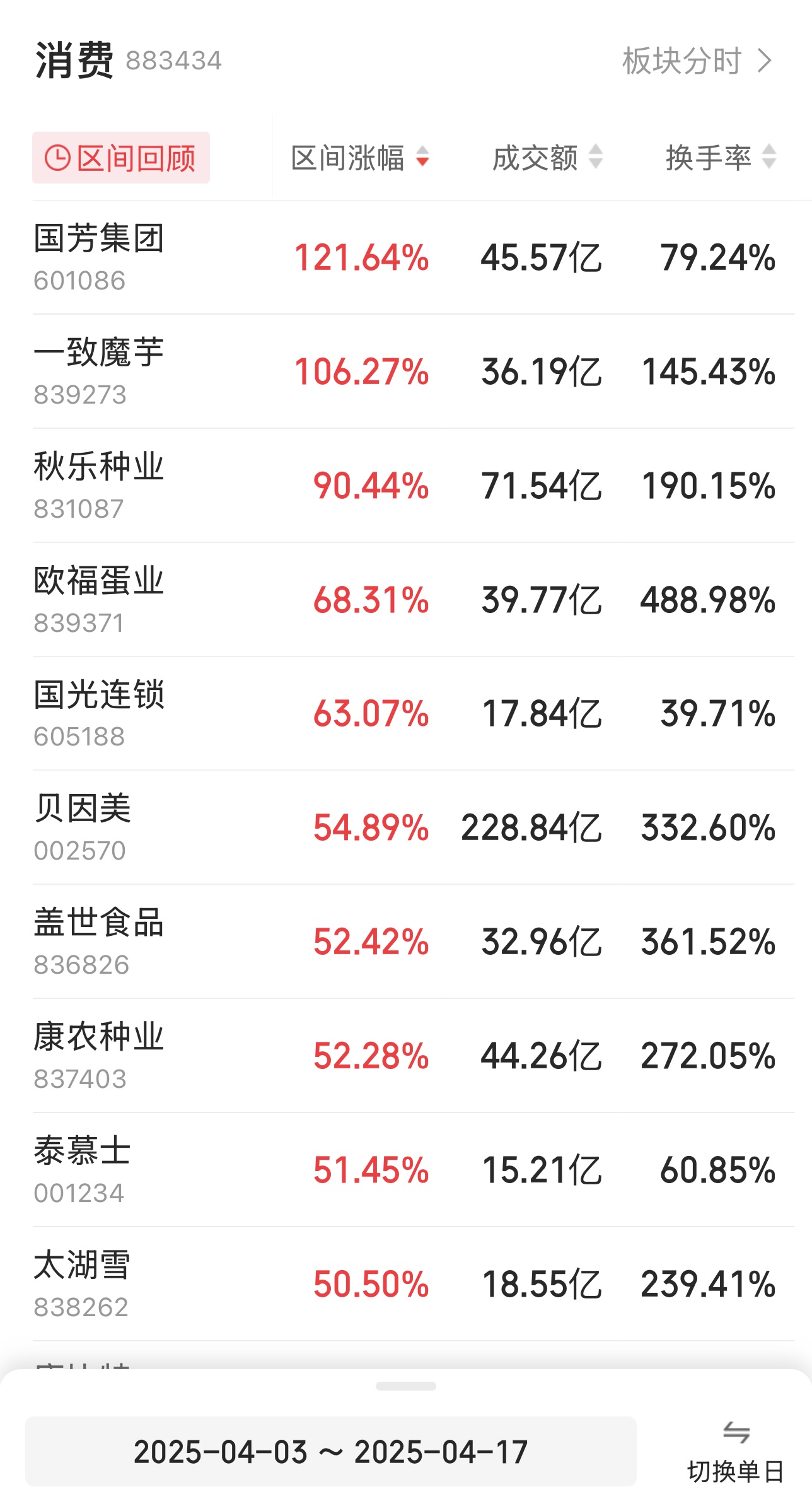 其中,國芳集團10個交易日錄得9個漲停,累計漲幅為121.64%,位居整個消費板塊同時段交易漲幅榜首位。該股今日收于10.55元/股,與清明節前的4月3日收盤價5.24元/股相比,股價已翻番。