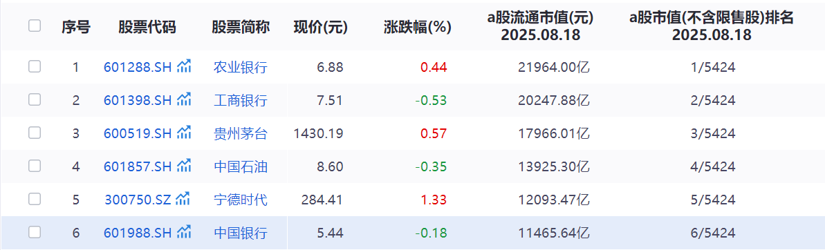 同花順iFind數據統計顯示,截至上午收盤時間,A股市值總和為114萬億元,突破100萬億元,創歷史新高,這也是A股市值歷史上首次突破100萬億元大關。具體來看,截至上午收盤時間,農業銀行位居A股市值榜首位,約為2.20萬億元,工商銀行A股市值2.02萬億元位居次席。此外,貴州茅臺、中國石油、寧德時代、中國銀行等4股A股市值均超萬億元。