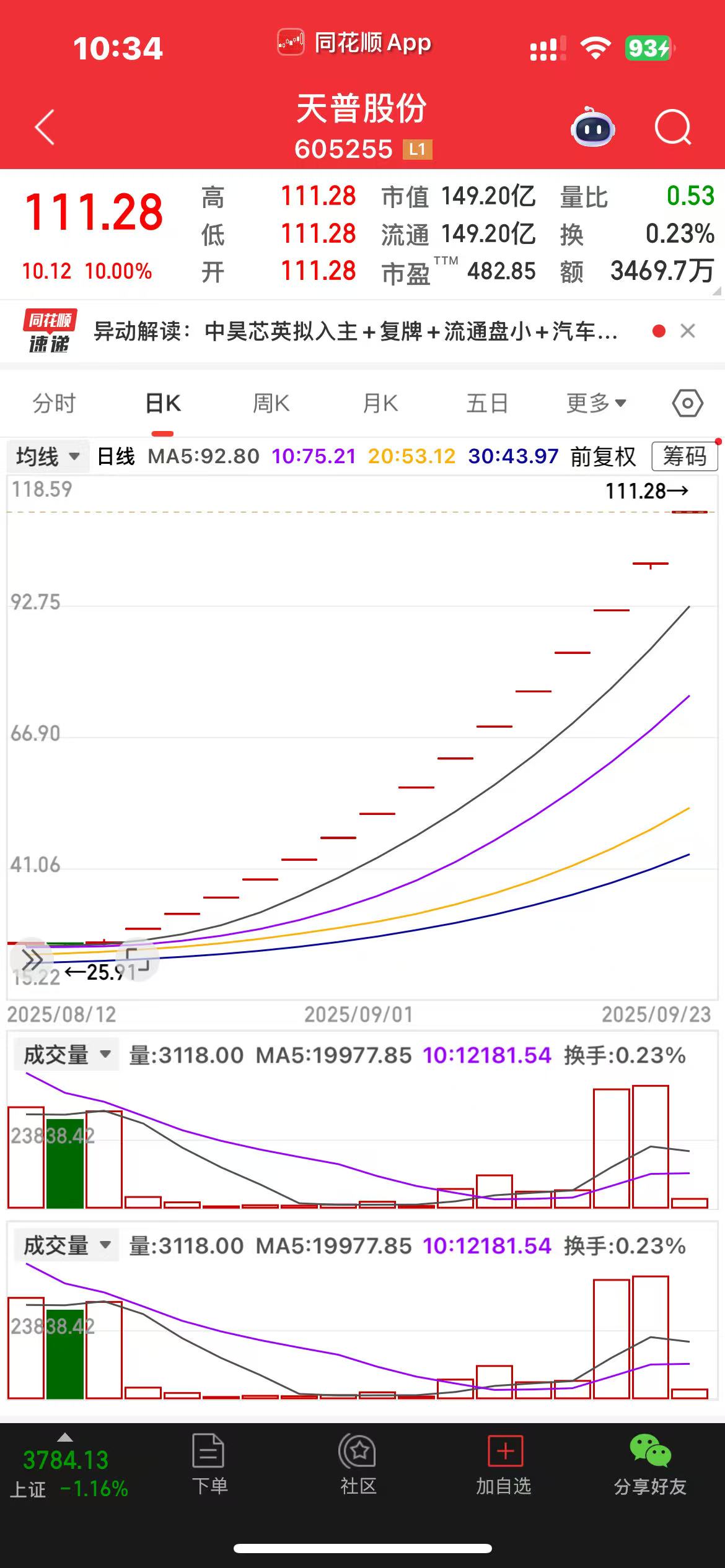 值得一提的是,9月23日,天普股份(605255)競價再度漲停,股價達成“15連板”,報111.28元/股。最新A股總市值達149.20億元。