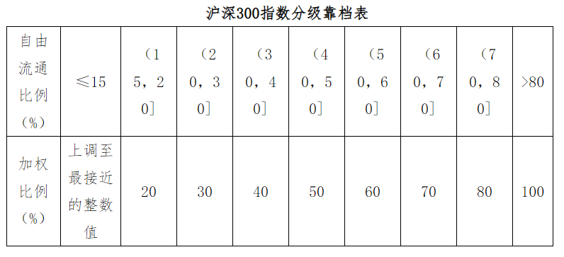 滬深300指數在確定樣本加權比例時,采用分級靠檔的方法,即根據證券的自由流通量占樣本總股本的比例(即自由流通比例)賦予總股本一定的加權比例,以確保計算指數的股本保持相對穩定。
